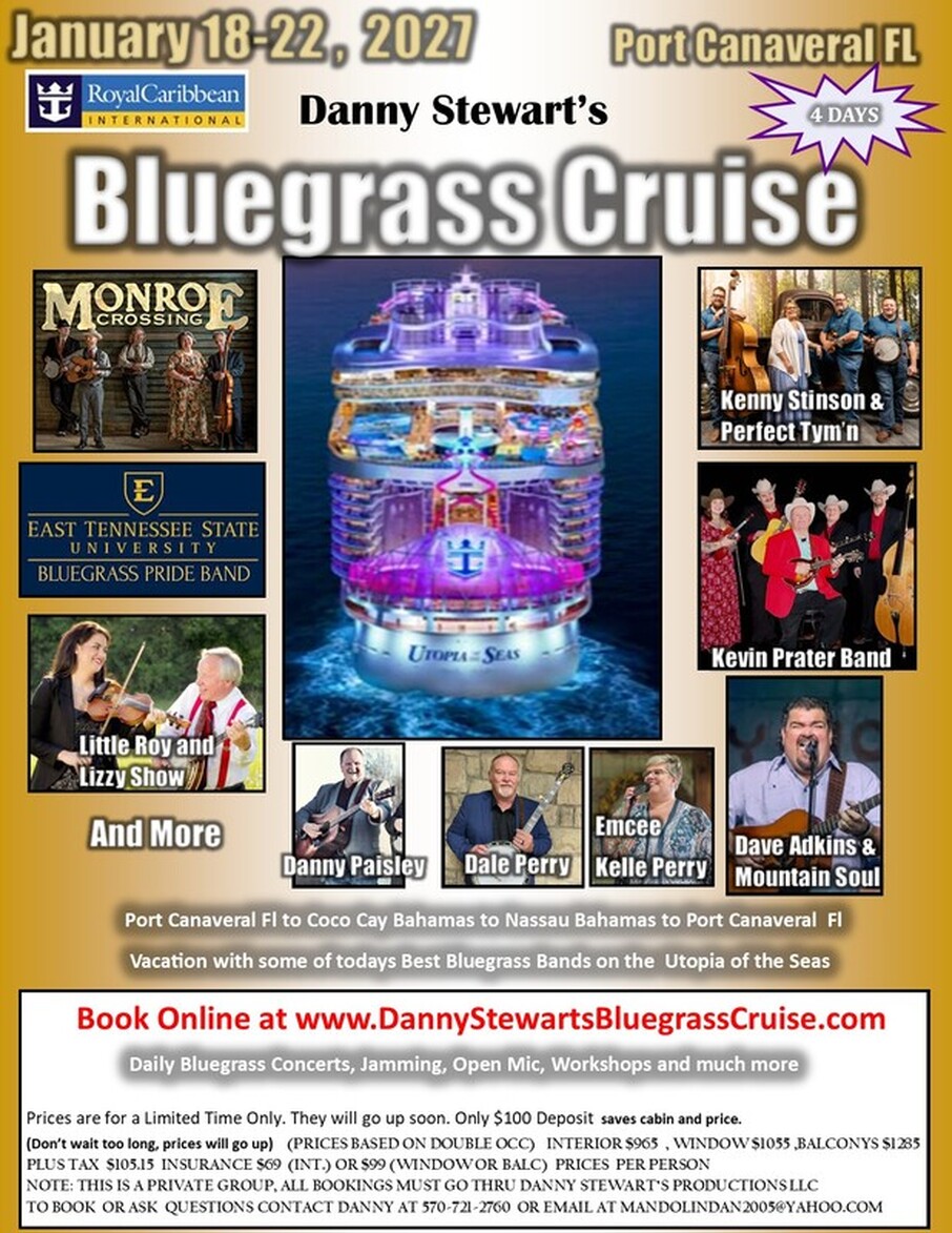 You can call Danny at 570-721-2760, or book online at Danny Stewart's Bluegrass Cruise and tell him we sent you.